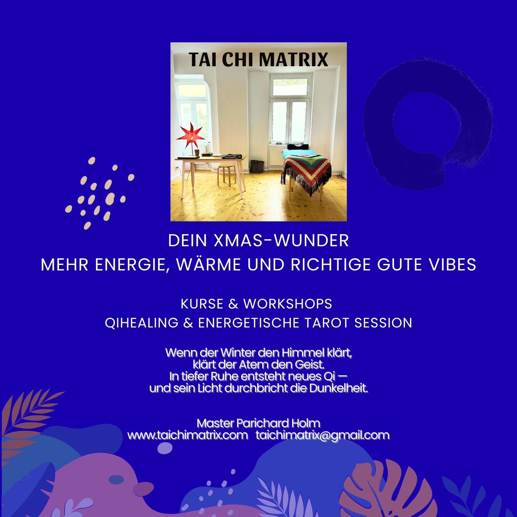 Meisterin Parichard Holm lädt dich ein, mit Bewusstsein und tiefer Erkenntnis in die Elemente und die Stadtnatur einzutauchen. Gemeinsam wandern wir durch die Jahreszeiten, entdecken die Kräfte der Natur und verwandeln uns Schritt für Schritt. Jede Woche wird die Transformation spürbarer – ein Weg zu mehr Klarheit, Stärke und Verbundenheit mit dir selbst und deiner Umwelt.